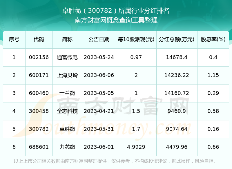 按照南方財(cái)富網(wǎng)趨勢(shì)選股系統(tǒng)統(tǒng)計(jì),卓勝微所屬行業(yè)為集成電路行業(yè),集成電路行業(yè)分紅排名情況如下表: