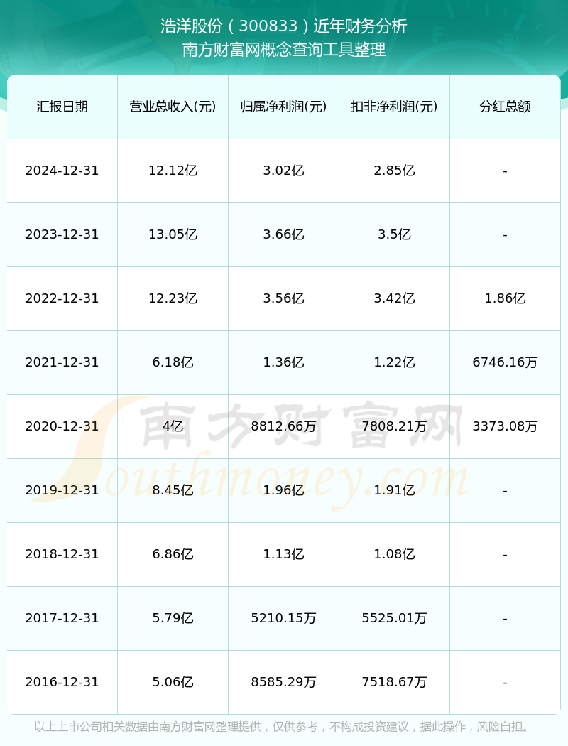 浩洋股份2024年總營收12.12億,同比增長-7.12%;凈利潤3.02億,同比增長-17.61%;銷售毛利率50.37%。