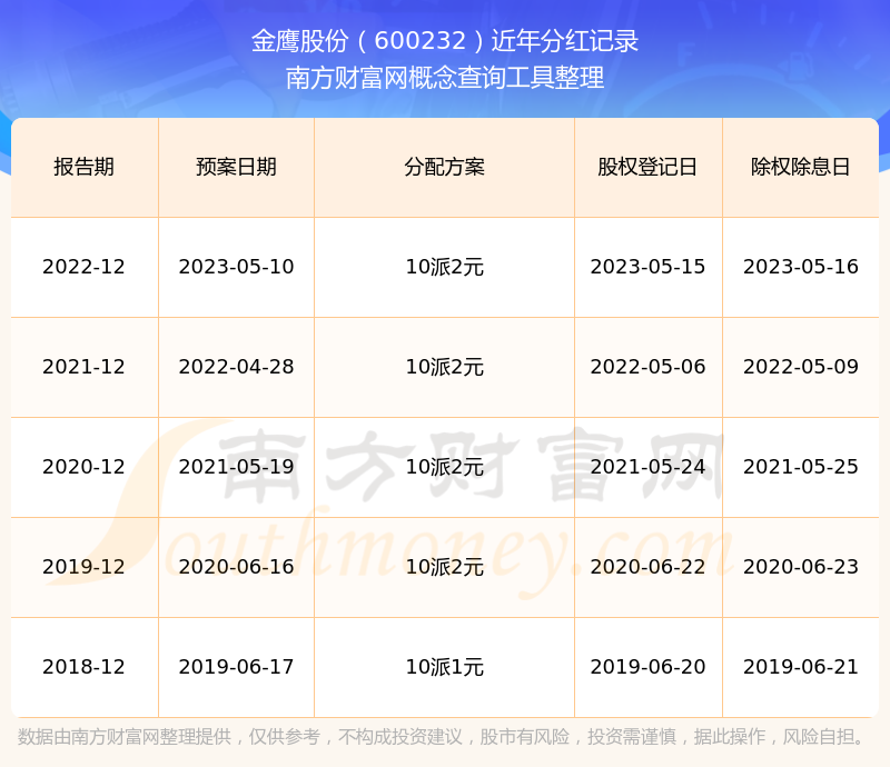 金鷹股份最新一次公布的分紅方案為10派2元。本次權益分派股權登記日為2023年5月15日,除權除息日為2023年5月16日,派息日為2023年5月16日。
