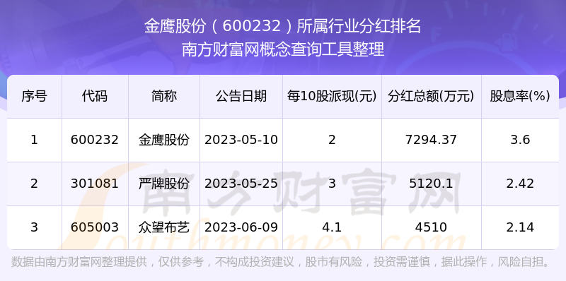 按照南方財富網趨勢選股系統統計,金鷹股份所屬行業為紡織品行業,紡織品行業分紅排名情況如下表: