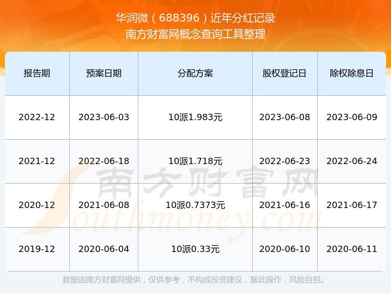 華潤微最新一次公布的分紅方案為10派1.983元。本次權益分派股權登記日為2023年6月8日,除權除息日為2023年6月9日,派息日為2023年6月9日。