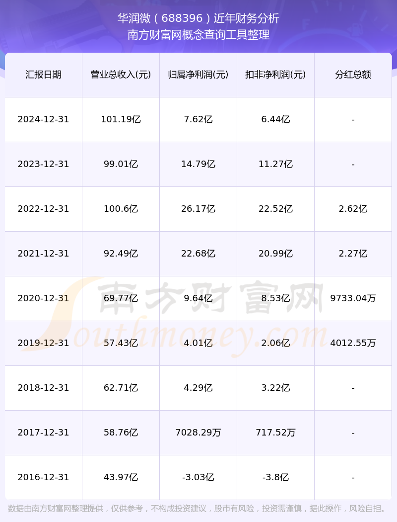 華潤微公司2024年實現營業收入101.19億元,同比增長2.2%;凈利潤7.62億元,同比增長-48.46%;毛利率27.19%。