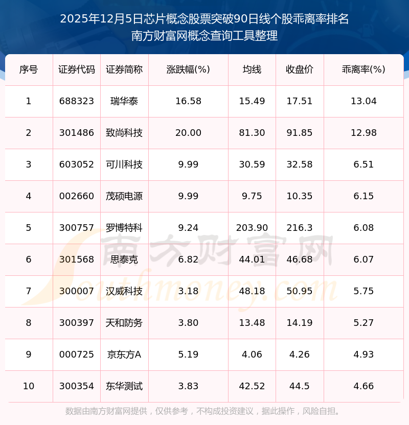 根據南方財富網概念查詢工具數據統計,截止2025年12月5日收盤,芯片概念股票共有27只個股收盤價向上突破了90日線。其中乖離率較大的個股有瑞華泰、致尚科技、可川科技等,乖離率分別為13.04%、12.98%、6.51%。