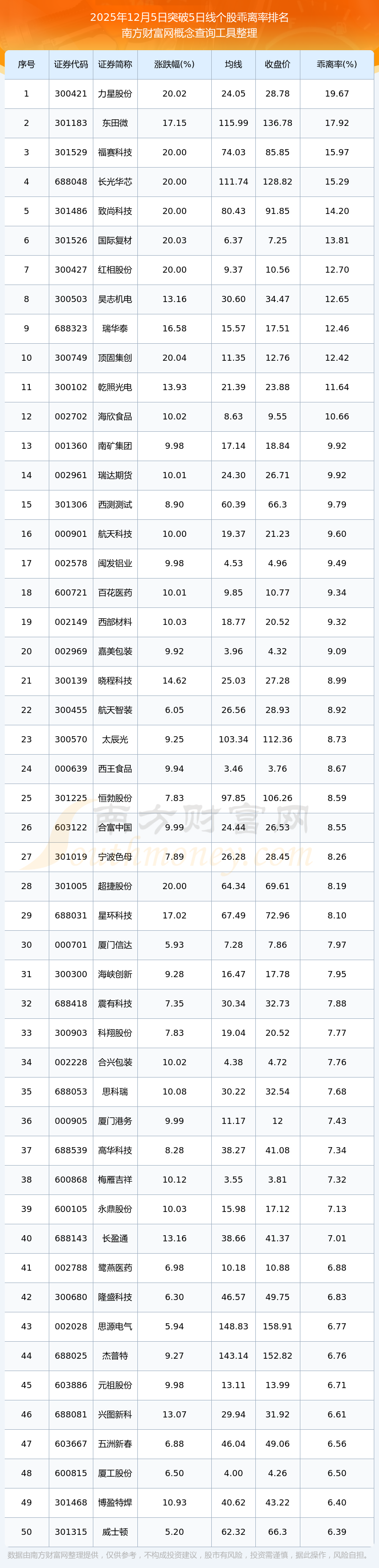 根據南方財富網概念查詢工具數據統計,截止2025年12月5日收盤,共有331只個股收盤價向上突破了5日線,其中乖離率較大的個股有力星股份、東田微、福賽科技、長光華芯、致尚科技等,乖離率分別為19.67%、17.92%、15.97%、15.29%、14.20%。
