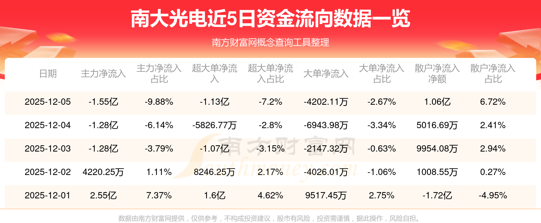資金流向數(shù)據(jù)方面,12月5日主力資金凈流流出1.55億元,超大單資金凈流出1.13億元,大單資金凈流出4202.11萬元,散戶資金凈流入1.06億元。