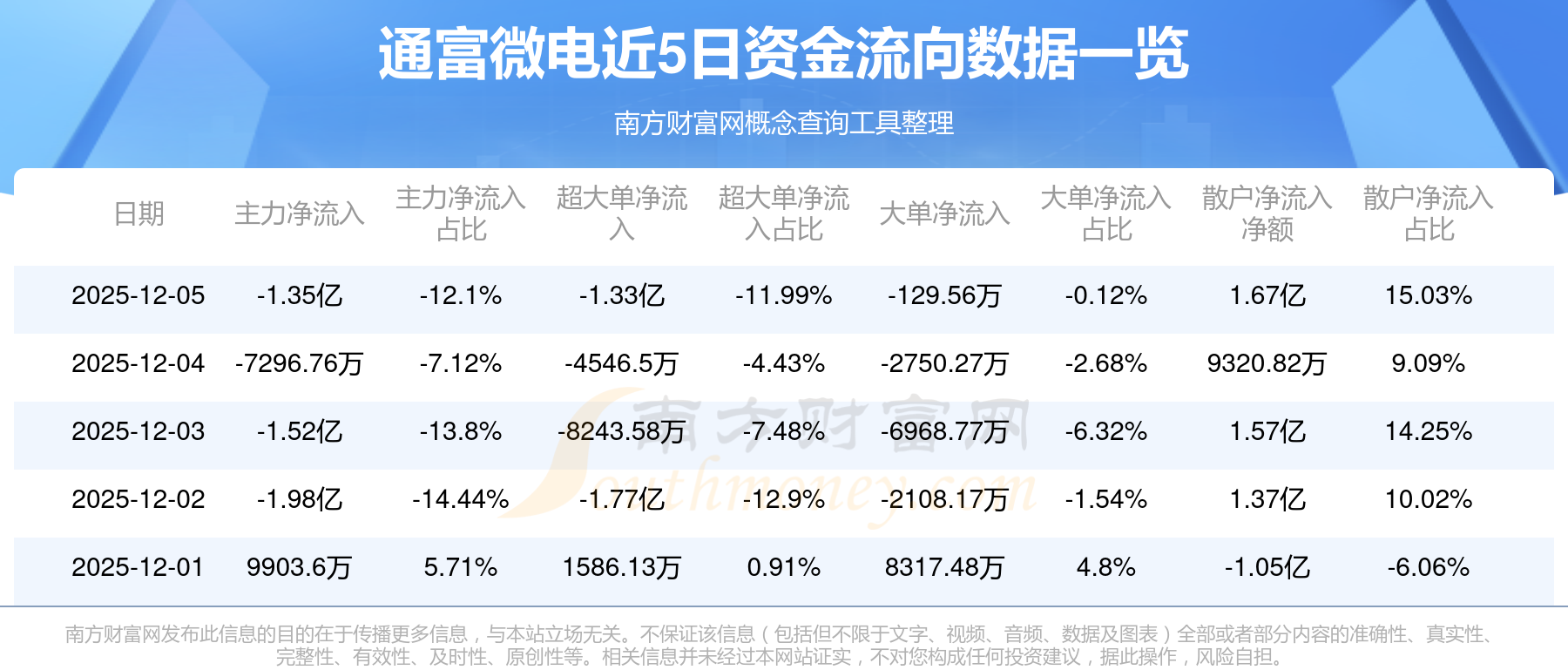 12月5日消息,通富微電資金凈流出1.35億元,超大單凈流出1.33億元,換手率2.01%,成交金額11.13億元。