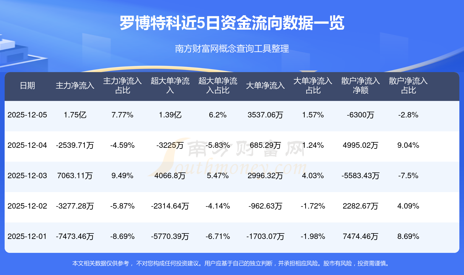 12月5日消息,羅博特科12月5日主力資金凈流入1.75億元,超大單資金凈流入1.39億元,大單資金凈流入3537.06萬元,散戶資金凈流出6300萬元。