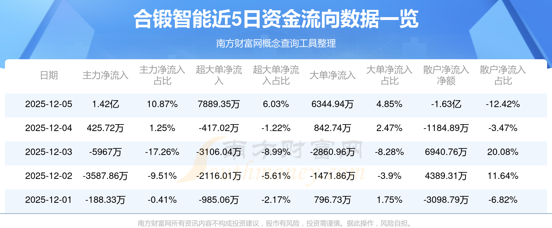 12月5日消息,合鍛智能主力凈流入1.42億元,超大單凈流入7889.35萬元,散戶凈流出1.63億元。
