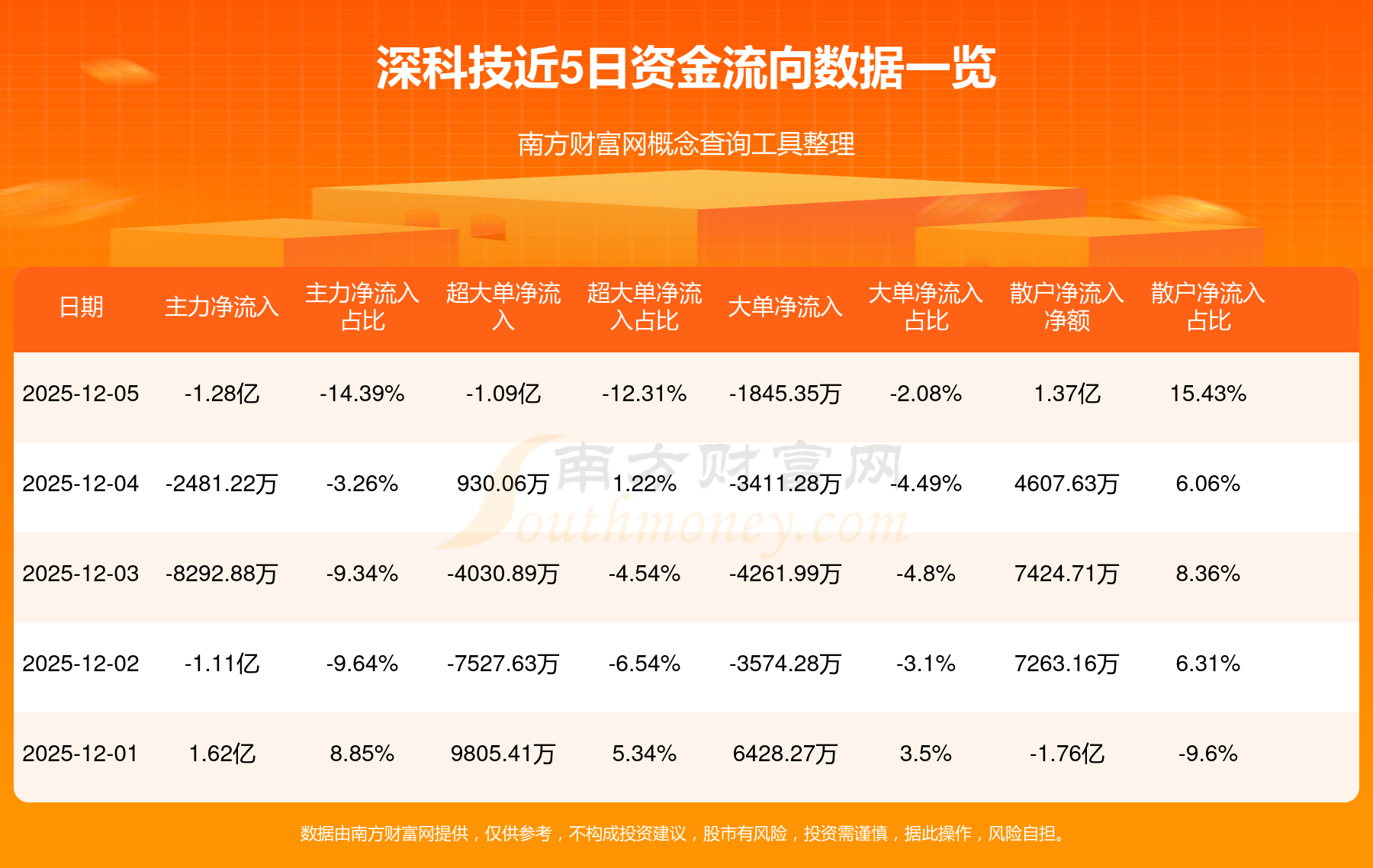 12月5日消息,深科技主力凈流出1.28億元,超大單凈流出1.09億元,散戶凈流入1.37億元。