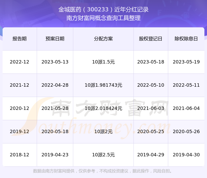 金城醫藥最新一次公布的分紅方案為10派1.5元。本次權益分派股權登記日為2023年5月18日,除權除息日為2023年5月19日,派息日為2023年5月19日。