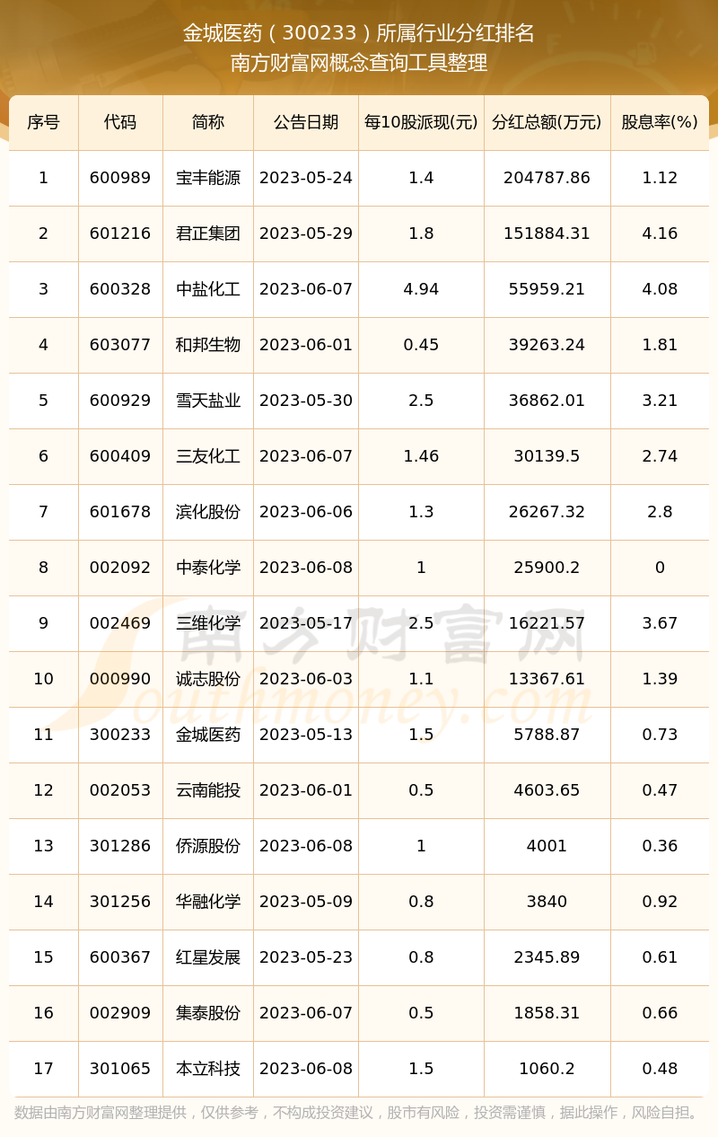 按照南方財富網趨勢選股系統統計,金城醫藥所屬行業為化學原料行業,化學原料行業分紅排名情況如下表: