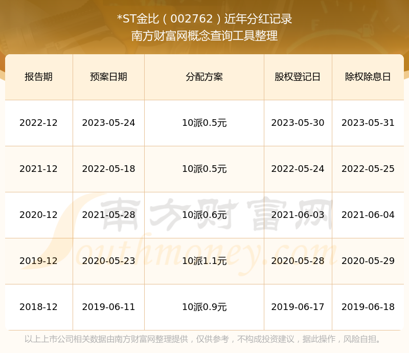 *ST金比最新一次公布的分紅方案為10派0.5元。本次權益分派股權登記日為2023年5月30日,除權除息日為2023年5月31日,派息日為2023年5月31日。