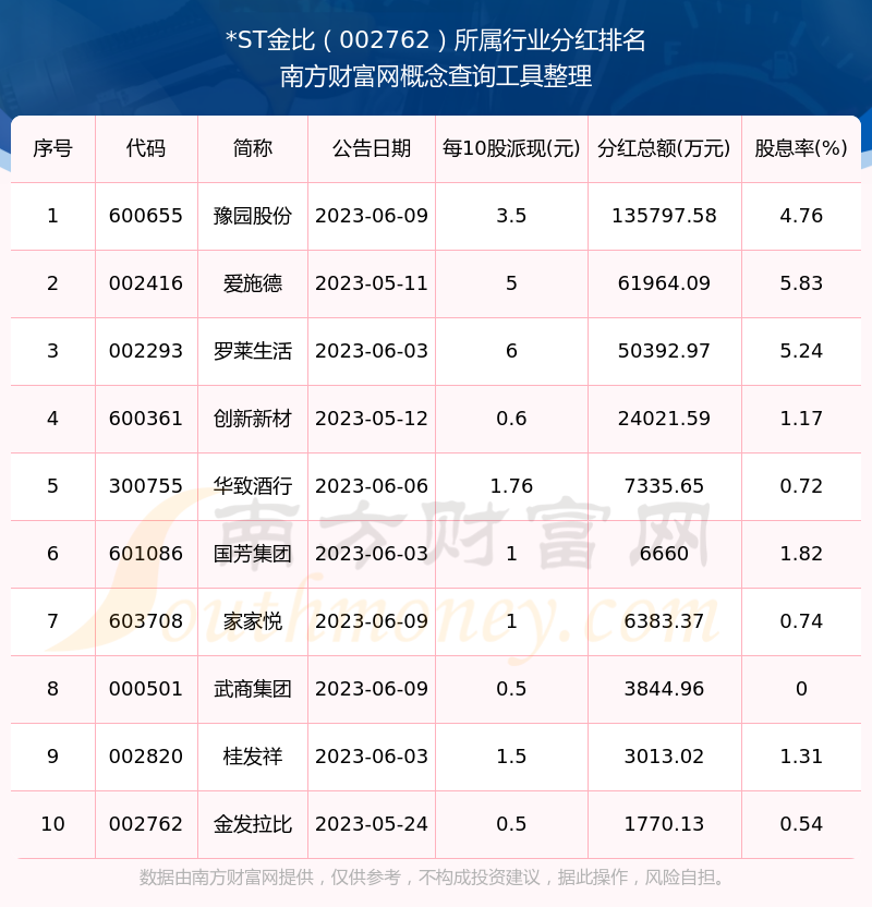 按照南方財富網趨勢選股系統統計,*ST金比所屬行業為紡織服裝行業,紡織服裝行業分紅排名情況如下表: