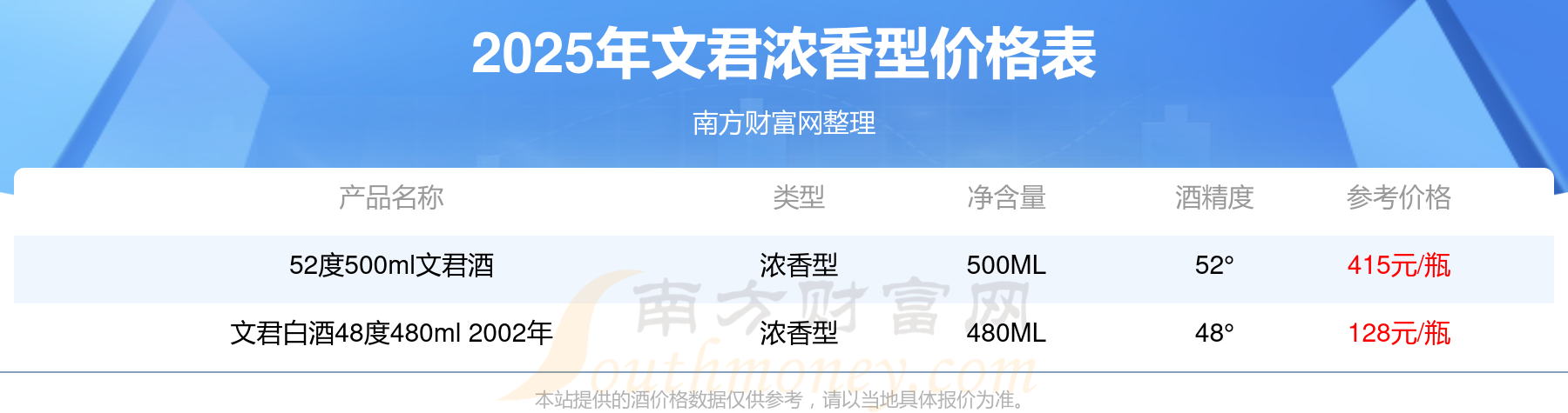 2025年,文君濃香型酒價(jià)格最高的是52度500ml文君酒,參考價(jià)415元,最低的是文君白酒48度480ml 2002年,參考價(jià)128元,價(jià)格高低差為287元。