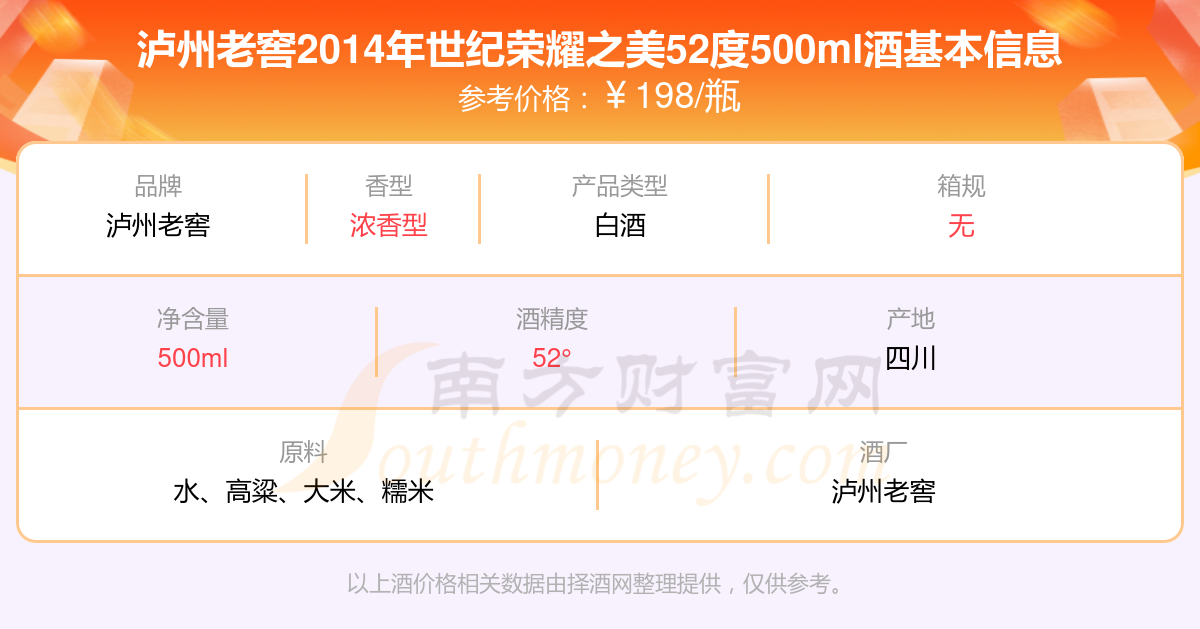 瀘州老窖2014年世紀榮耀之美52度500ml基本信息