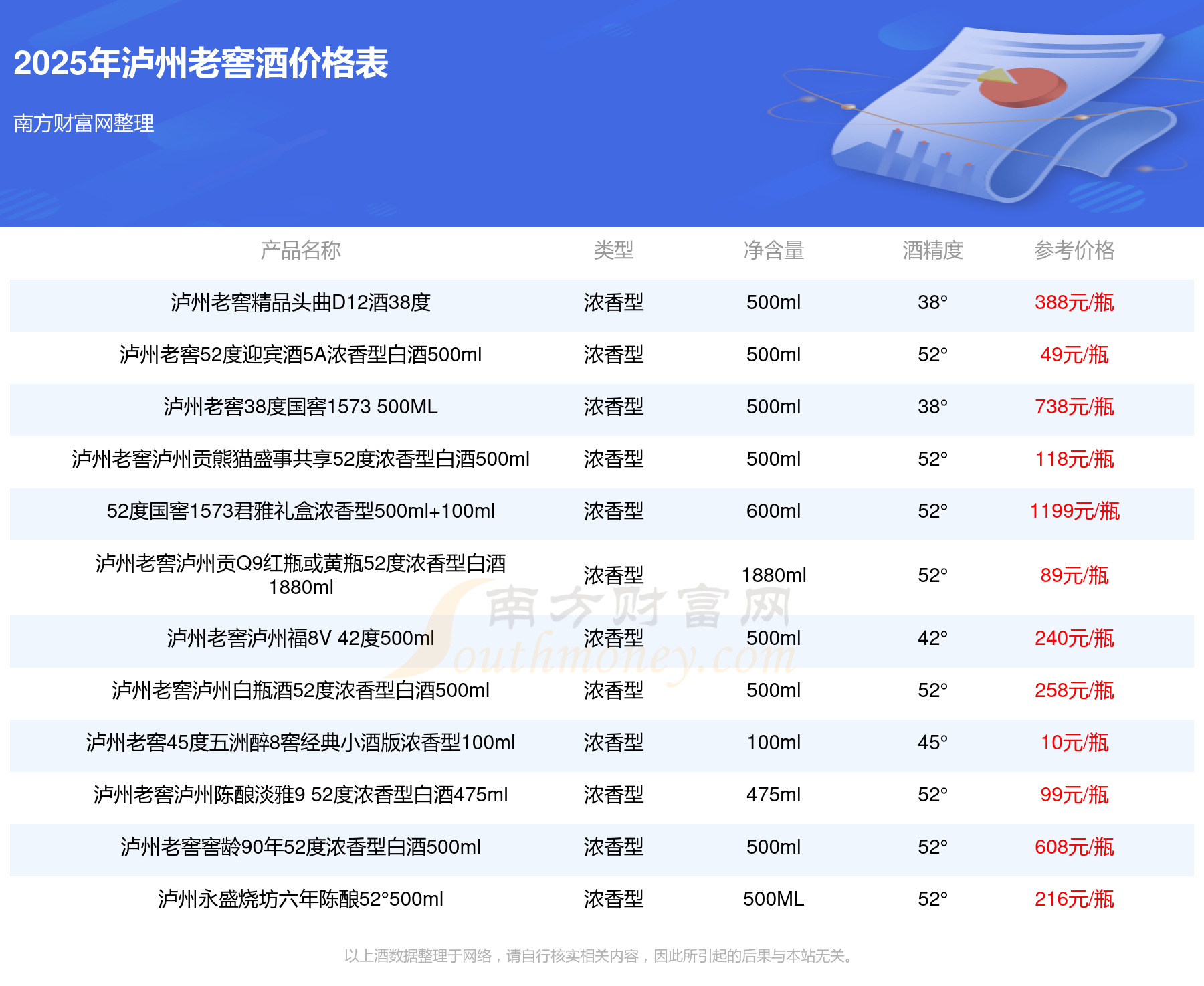 瀘州老窖酒最新價格2025:瀘州老窖國窖1573春釀鼠兆豐年E 55度參考價17999元/瓶、瀘州老窖國窖1573生命中的那壇酒55度014參考價9999元/瓶、瀘州老窖國窖1573春釀鼠兆豐年A 55度參考價5088元/瓶、瀘州老窖國窖1573生命中的那壇酒55度013濃香型白酒1000ml參考價4988元/瓶、瀘州老窖國窖1573生命中的那壇酒55度009 1000ml參考價4288元/瓶。