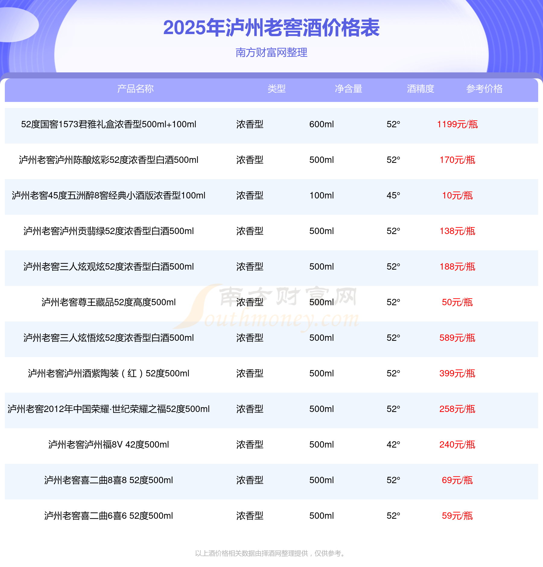 瀘州老窖國窖1573春釀鼠兆豐年E 55度參考價17999元/瓶、瀘州老窖國窖1573生命中的那壇酒55度014參考價9999元/瓶、瀘州老窖國窖1573春釀鼠兆豐年A 55度參考價5088元/瓶、瀘州老窖國窖1573生命中的那壇酒55度013濃香型白酒1000ml參考價4988元/瓶、瀘州老窖國窖1573生命中的那壇酒55度009 1000ml參考價4288元/瓶、瀘州老窖國窖1573中國品味52度濃香型白酒500ml參考價2888元/瓶。
