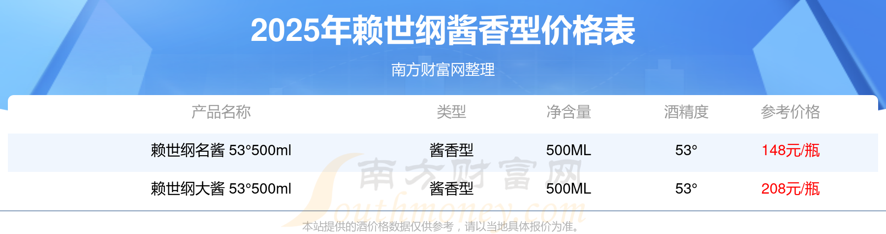 2025年賴世綱醬香型酒賴世綱大醬 53°500ml、賴世綱名醬 53°500ml等最新價格如下: