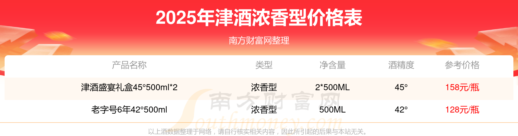 津酒濃香型酒最新價(jià)格2025:津酒盛宴禮盒45°500ml*2參考價(jià)158元/瓶、老字號(hào)6年42°500ml參考價(jià)128元/瓶。