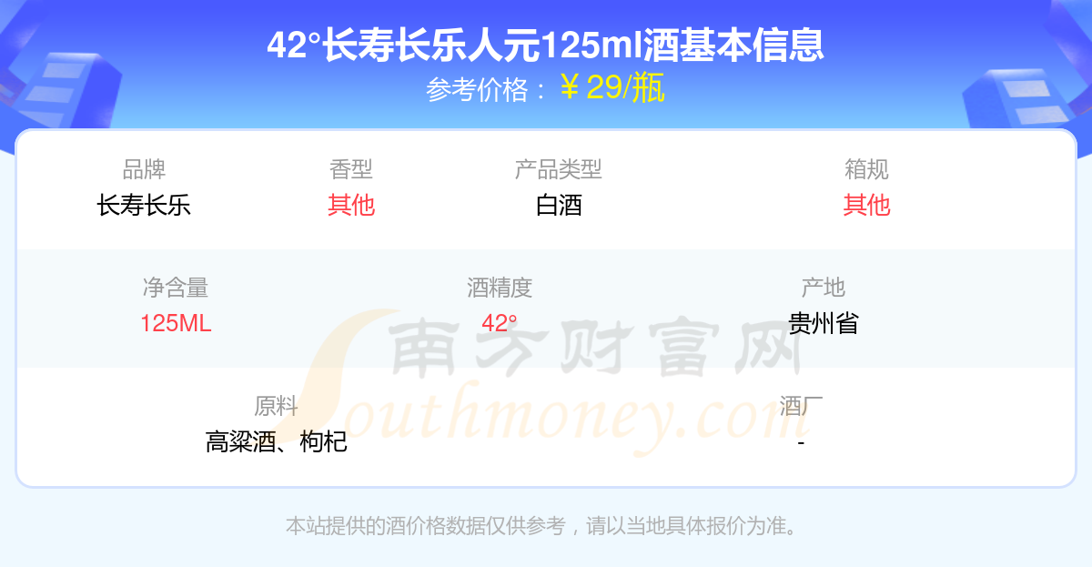 42°長壽長樂人元125ml酒價格2025查詢