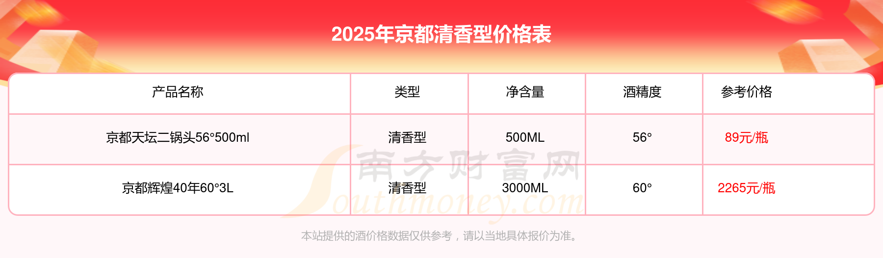 京都輝煌40年60°3L參考價2265元/瓶、京都天壇二鍋頭56°500ml參考價89元/瓶。