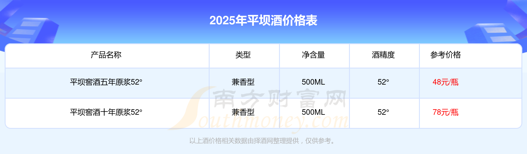 2025平壩酒最新價格:平壩窖酒十年原漿52°參考價78元/瓶、平壩窖酒五年原漿52°參考價48元/瓶。