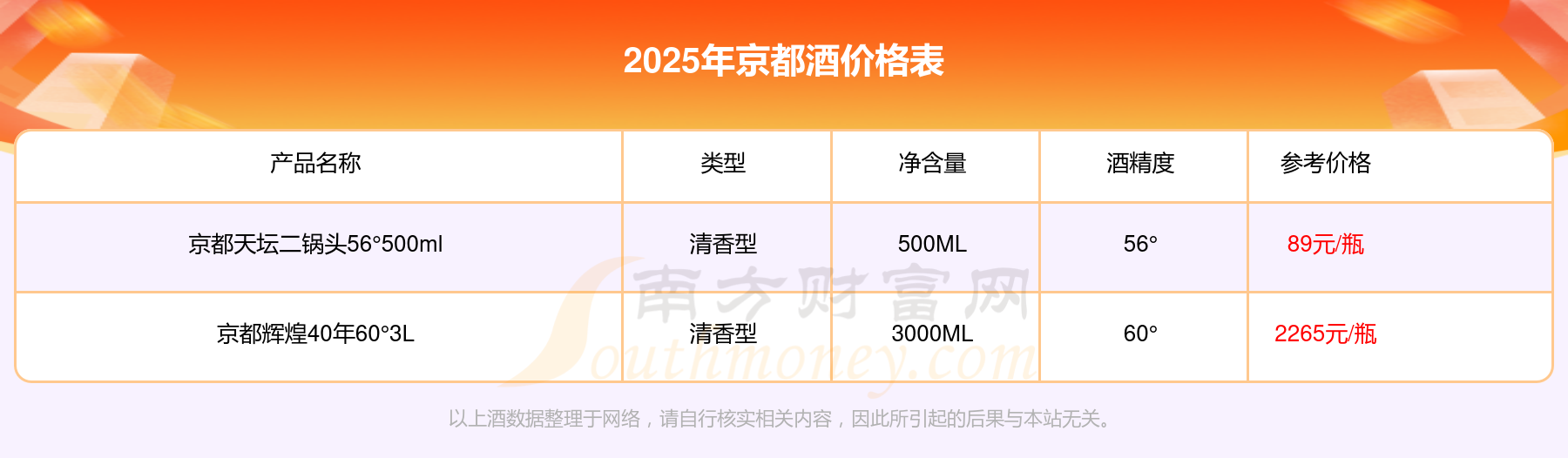 2025年,京都輝煌40年60°3L、京都天壇二鍋頭56°500ml等京都酒價格如下: