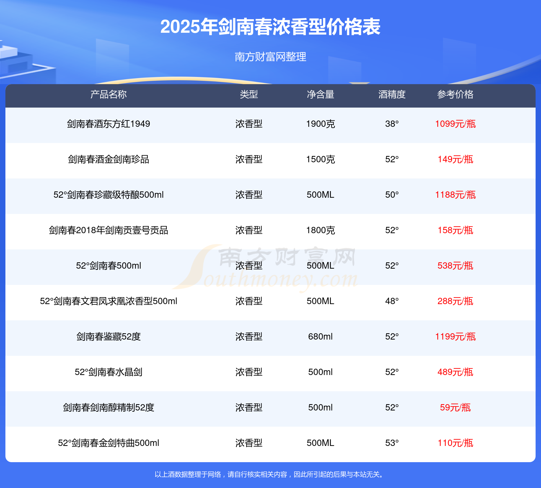劍南春鑒藏52度參考價1199元/瓶、52°劍南春珍藏級特釀500ml參考價1188元/瓶、劍南春酒東方紅1949參考價1099元/瓶、52°劍南春500ml參考價538元/瓶、52°劍南春水晶劍參考價489元/瓶。