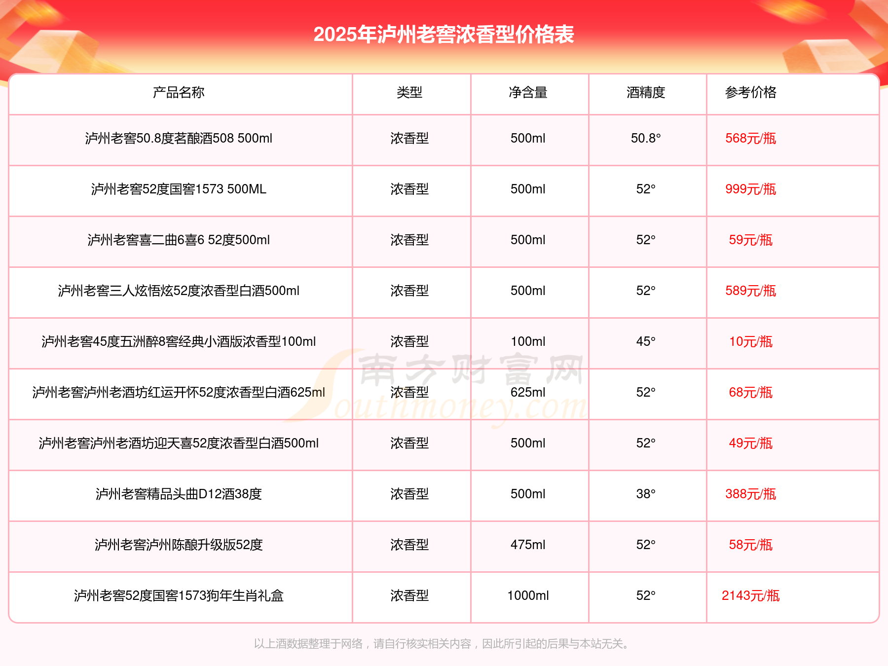 2025年,瀘州老窖國(guó)窖1573春釀鼠兆豐年E 55度、瀘州老窖國(guó)窖1573生命中的那壇酒55度014、瀘州老窖國(guó)窖1573春釀鼠兆豐年A 55度、瀘州老窖國(guó)窖1573生命中的那壇酒55度013濃香型白酒1000ml等瀘州老窖濃香型酒價(jià)格如下: