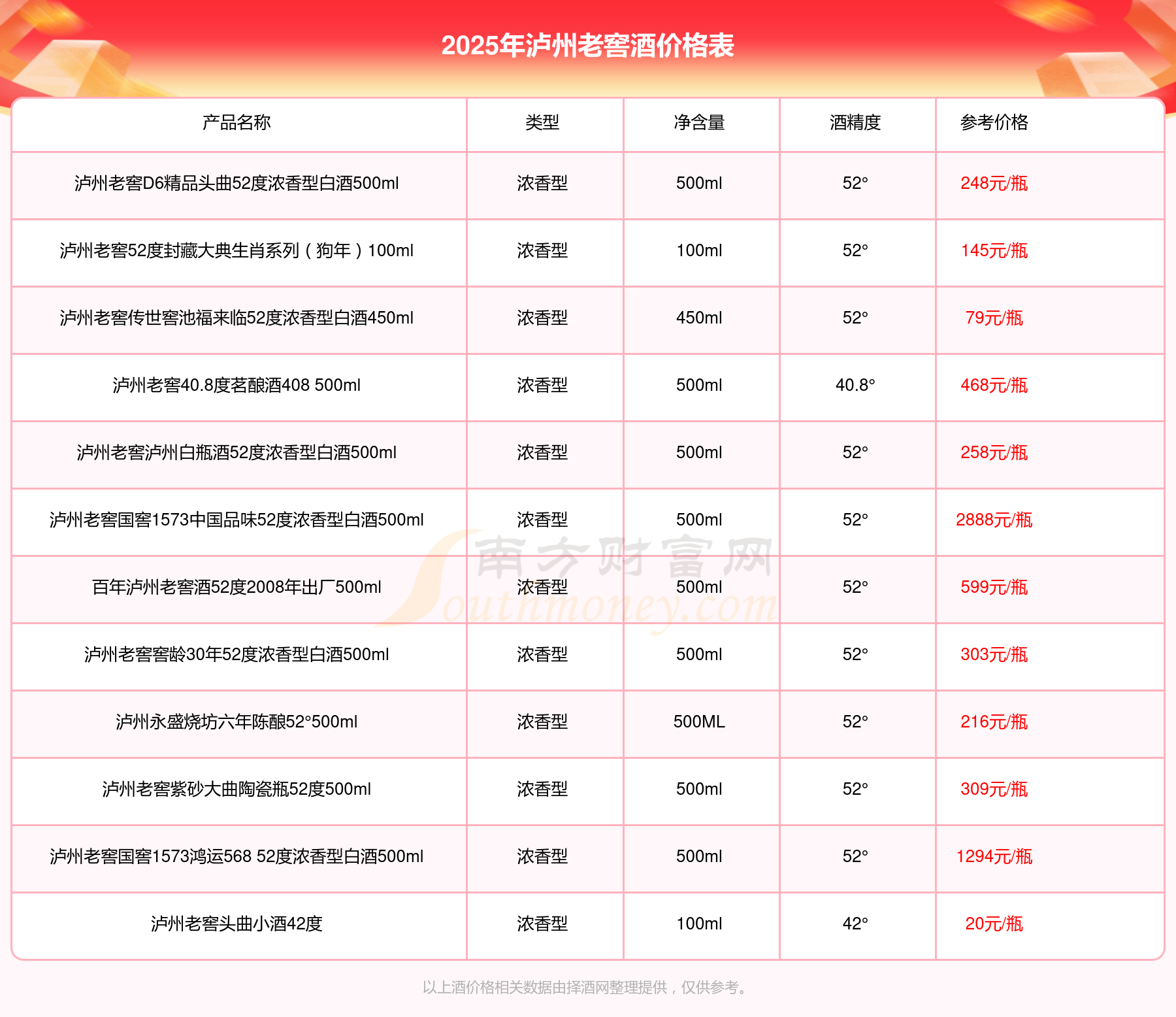 2025年,瀘州老窖國窖1573春釀鼠兆豐年E 55度、瀘州老窖國窖1573生命中的那壇酒55度014、瀘州老窖國窖1573春釀鼠兆豐年A 55度、瀘州老窖國窖1573生命中的那壇酒55度013濃香型白酒1000ml、瀘州老窖國窖1573生命中的那壇酒55度009 1000ml、瀘州老窖國窖1573中國品味52度濃香型白酒500ml、瀘州老窖國窖1573許燎源概念作品58度濃香型白酒1000ml等瀘州老窖酒價格如下:瀘州老窖國窖1573春釀鼠兆豐年E 55度參考價17999元/瓶、瀘州老窖國窖1573生命中的那壇酒55度014參考價9999元/瓶、瀘州老窖國窖1573春釀鼠兆豐年A 55度參考價5088元/瓶、瀘州老窖國窖1573生命中的那壇酒55度013濃香型白酒1000ml參考價4988元/瓶、瀘州老窖國窖1573生命中的那壇酒55度009 1000ml參考價4288元/瓶、瀘州老窖國窖1573中國品味52度濃香型白酒500ml參考價2888元/瓶、瀘州老窖國窖1573許燎源概念作品58度濃香型白酒1000ml參考價2680元/瓶。
