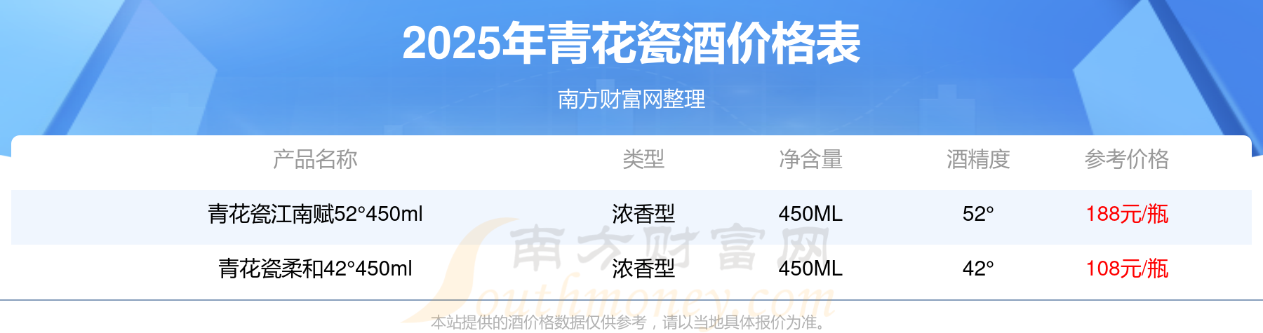 2025年,青花瓷江南賦52°450ml、青花瓷柔和42°450ml等青花瓷酒價格如下: