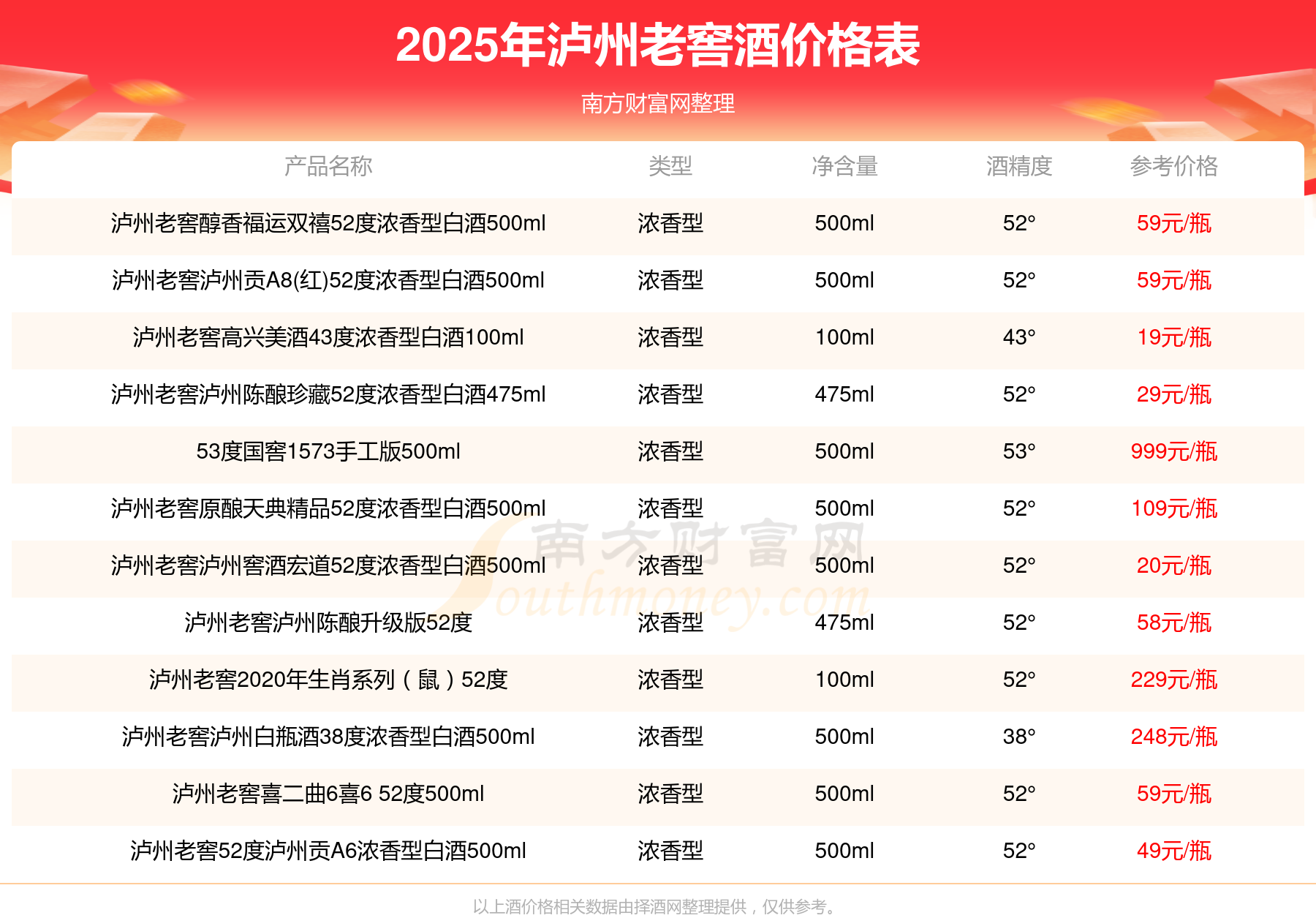 2025年,瀘州老窖國窖1573春釀鼠兆豐年E 55度、瀘州老窖國窖1573生命中的那壇酒55度014、瀘州老窖國窖1573春釀鼠兆豐年A 55度、瀘州老窖國窖1573生命中的那壇酒55度013濃香型白酒1000ml、瀘州老窖國窖1573生命中的那壇酒55度009 1000ml、瀘州老窖國窖1573中國品味52度濃香型白酒500ml等瀘州老窖酒價格如下:瀘州老窖國窖1573春釀鼠兆豐年E 55度參考價17999元/瓶、瀘州老窖國窖1573生命中的那壇酒55度014參考價9999元/瓶、瀘州老窖國窖1573春釀鼠兆豐年A 55度參考價5088元/瓶、瀘州老窖國窖1573生命中的那壇酒55度013濃香型白酒1000ml參考價4988元/瓶、瀘州老窖國窖1573生命中的那壇酒55度009 1000ml參考價4288元/瓶、瀘州老窖國窖1573中國品味52度濃香型白酒500ml參考價2888元/瓶。