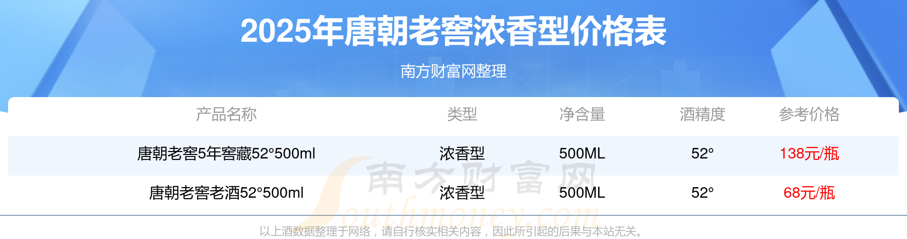 2025唐朝老窖濃香型酒最新價格:唐朝老窖5年窖藏52°500ml參考價138元/瓶、唐朝老窖老酒52°500ml參考價68元/瓶。