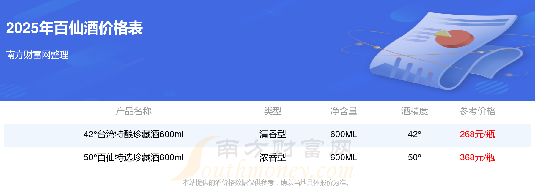 2025年,50°百仙特選珍藏酒600ml、42°臺灣特釀珍藏酒600ml等百仙酒價格如下: