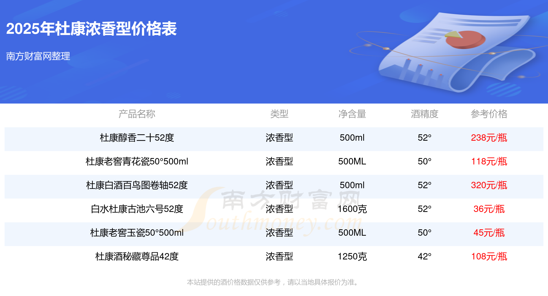 2025年,杜康白酒百鳥圖卷軸52度、杜康醇香二十52度、杜康老窖青花瓷50°500ml、杜康酒秘藏尊品42度、杜康老窖玉瓷50°500ml等杜康濃香型酒價格如下:杜康白酒百鳥圖卷軸52度參考價320元/瓶、杜康醇香二十52度參考價238元/瓶、杜康老窖青花瓷50°500ml參考價118元/瓶、杜康酒秘藏尊品42度參考價108元/瓶、杜康老窖玉瓷50°500ml參考價45元/瓶。