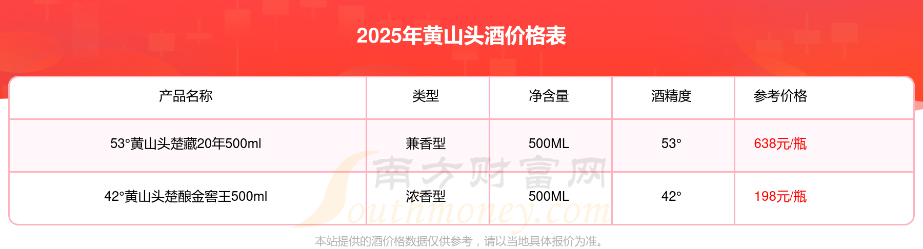 2025黃山頭酒最新價格:53°黃山頭楚藏20年500ml參考價638元/瓶、42°黃山頭楚釀金窖王500ml參考價198元/瓶。
