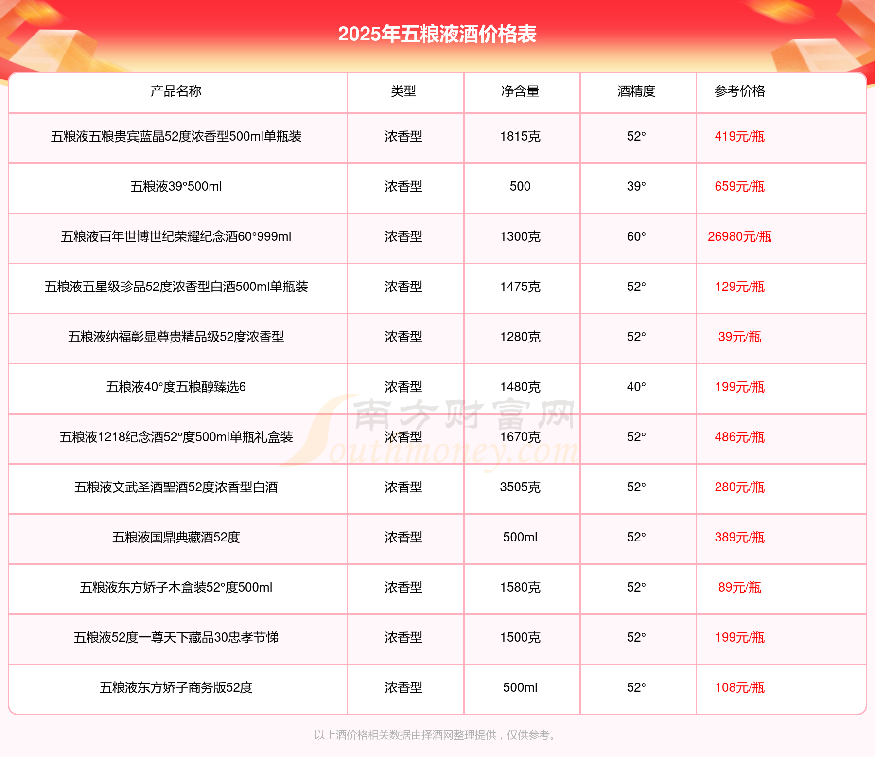 目前,五糧液酒價格最高的酒為五糧液百年世博世紀榮耀紀念酒60°999ml,參考價26980元/瓶,而五糧液酒價格最低的是五糧液干一杯小瓶46度,參考價16元/瓶,價格高低差為26964元/瓶。