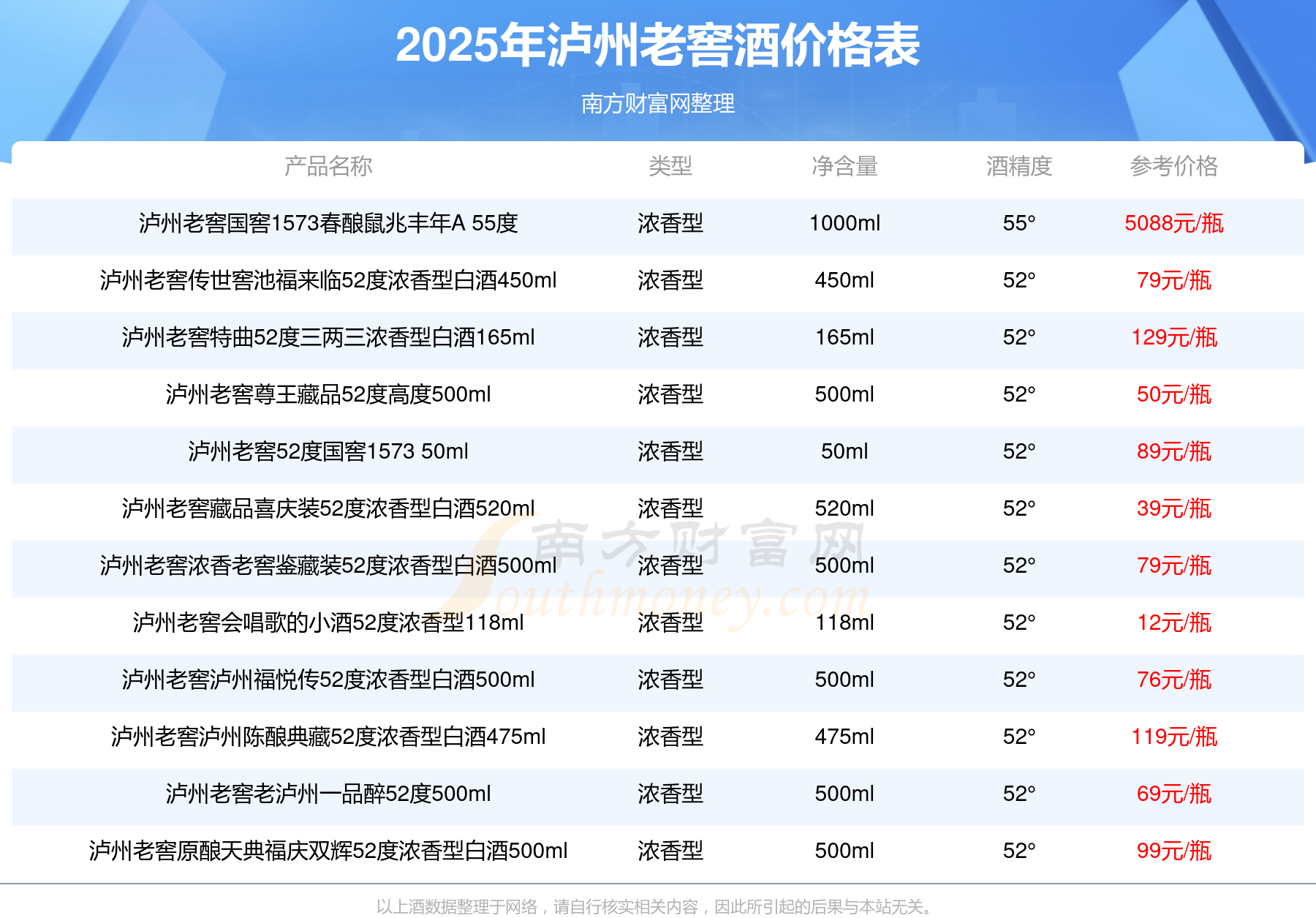 瀘州老窖酒最新價格2025:瀘州老窖國窖1573春釀鼠兆豐年E 55度參考價17999元/瓶、瀘州老窖國窖1573生命中的那壇酒55度014參考價9999元/瓶、瀘州老窖國窖1573春釀鼠兆豐年A 55度參考價5088元/瓶。