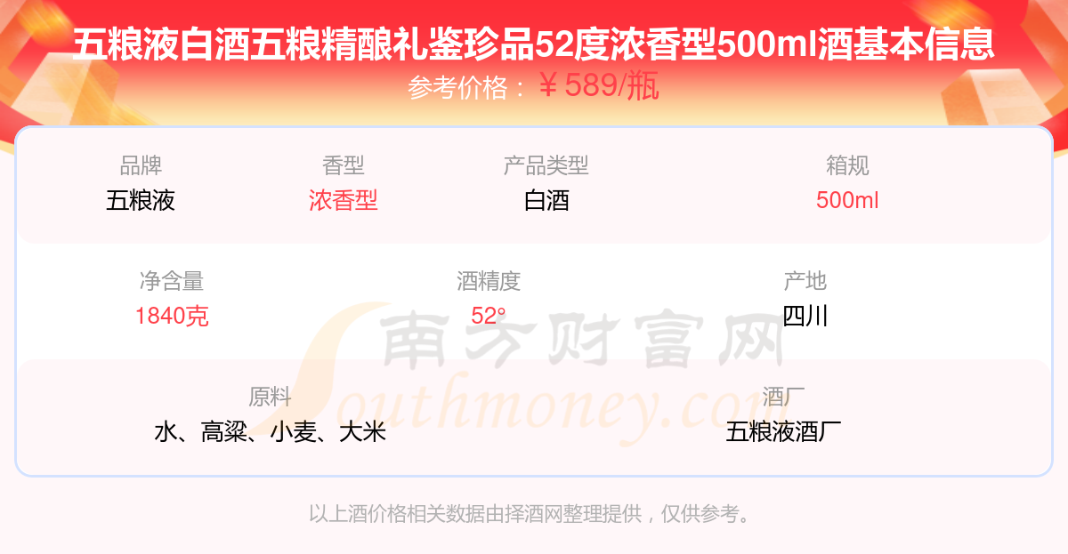 五糧液白酒五糧精釀禮鑒珍品52度濃香型500ml基本信息
