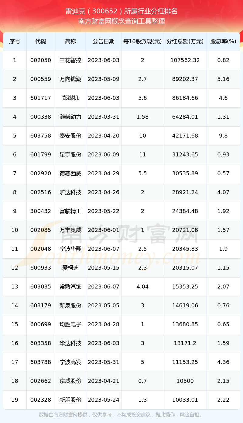 按照南方財富網趨勢選股系統統計,雷迪克所屬行業為汽車零部件行業,汽車零部件行業分紅排名情況如下表: