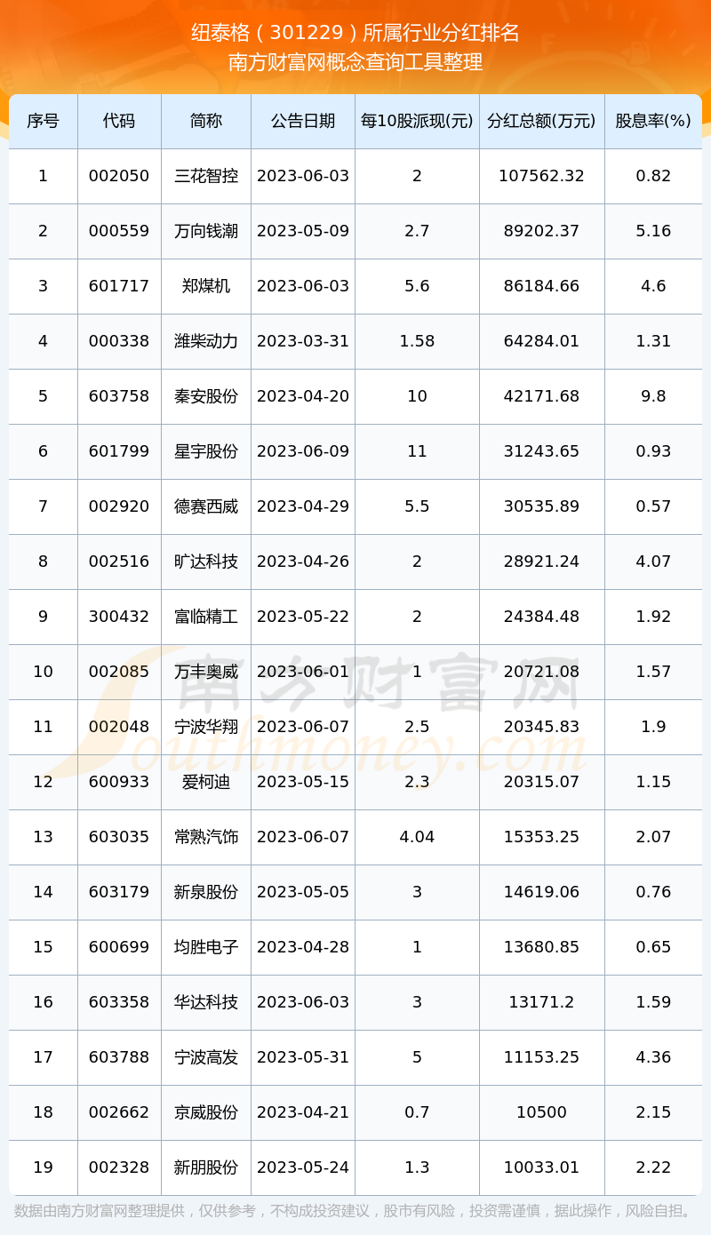 二、紐泰格301229行業分紅排名
