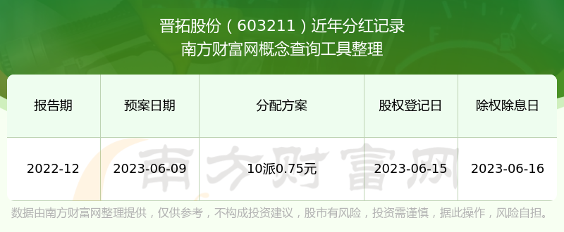 晉拓股份最新一次公布的分紅方案:10派0.75元。