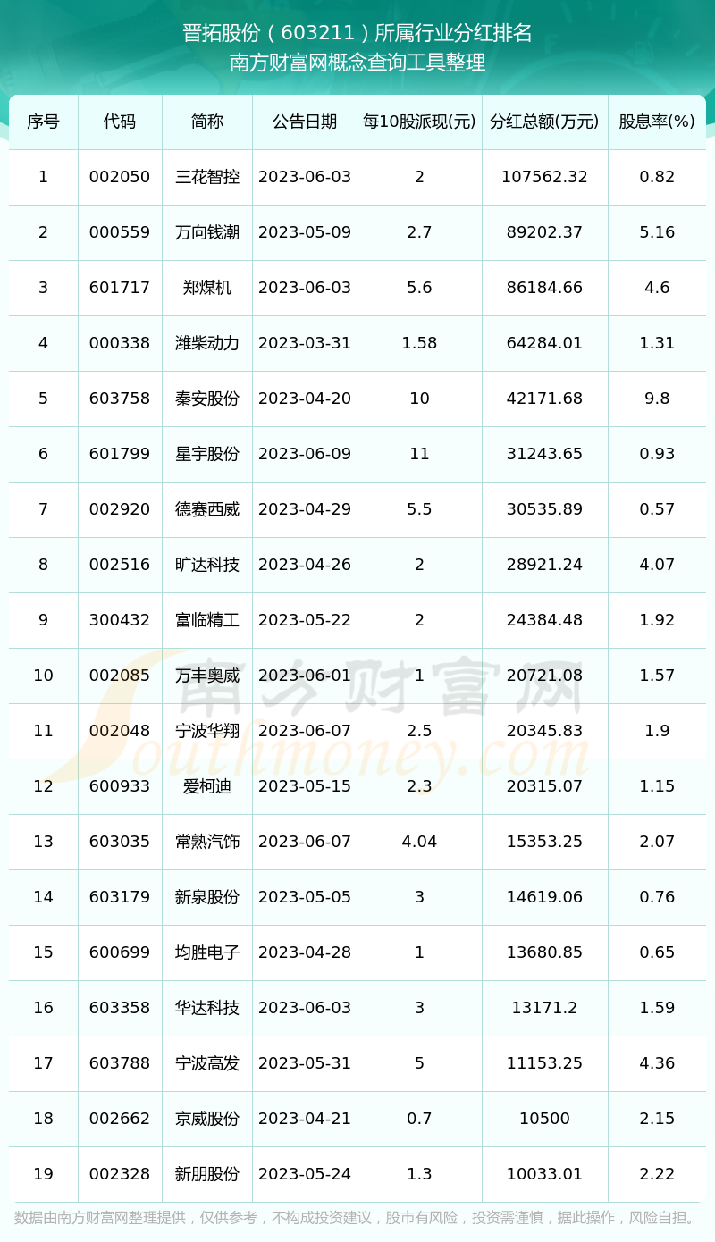 按照南方財富網趨勢選股系統統計,晉拓股份所屬行業為汽車零部件行業,汽車零部件行業分紅排名情況如下表: