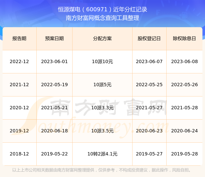 恒源煤電最新一次公布的分紅方案為10派10元。本次權益分派股權登記日為2023年6月7日,除權除息日為2023年6月8日,派息日為2023年6月8日。