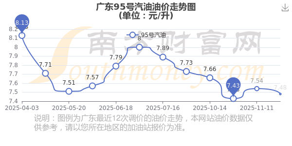 12月7日,廣東汽油、柴油每升最新價格為:92號汽油為6.91元,下調了0.05元;95號汽油為7.48元,下調了0.06元;89號汽油為6.41元,下調了0.05;0號柴油為6.53元,下調了0.06元,調整時間為11月25日。
