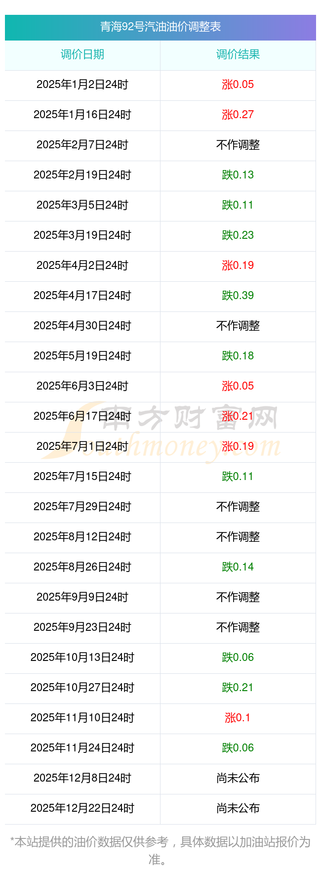 青海92號汽油油價調整表