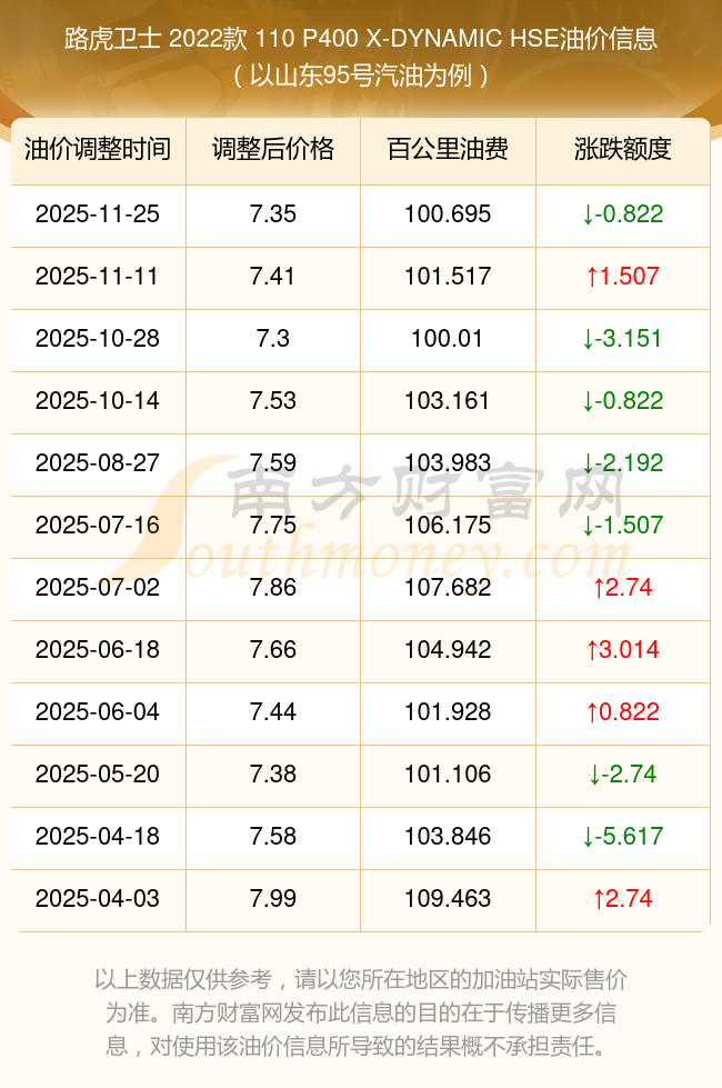 按照11月25日95號(hào)汽油最新調(diào)整價(jià)格7.35元/升來(lái)計(jì)算(以山東為例),該車(chē)型百公里平均油費(fèi)為100.695元,按照上一輪11月11日調(diào)整價(jià)格7.41元/升來(lái)計(jì)算,百公里平均油費(fèi)為101.517元,對(duì)比上一輪少花0.822元,下一輪油價(jià)調(diào)整時(shí)間為12月8日24時(shí)。