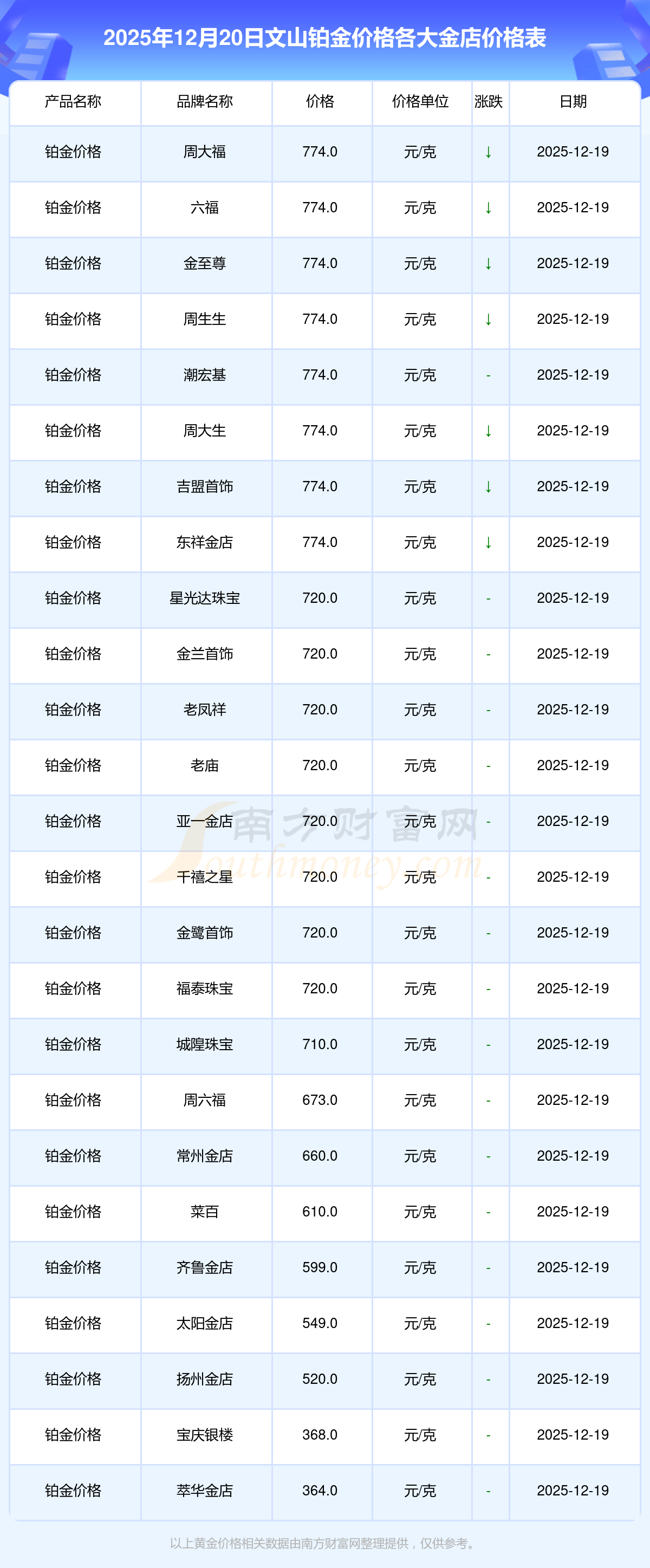 2025年12月20日文山各大金店鉑金價格最新價格:星光達(dá)珠寶1356.0元/克,星光達(dá)珠寶720.0元/克,寶泉錢幣15.1元/克,金蘭首飾1356.0元/克,金蘭首飾720.0元/克,謝瑞麟1207.0元/克,謝瑞麟1353.0元/克,謝瑞麟47920.0,謝瑞麟16330.0,謝瑞麟43260.0,金銀街1328.0元/克。