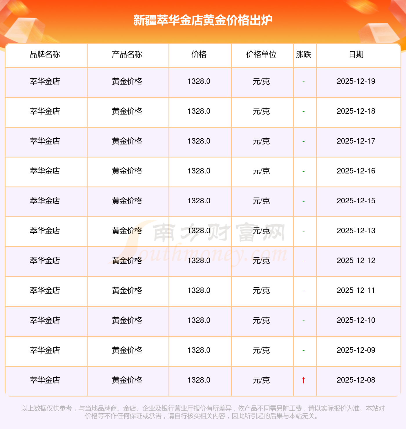 今日新疆萃華金店黃金價格公布想問問,今日黃金每克的定價為多少新疆萃華金店 2025年12月20日的黃金價格價位為 1328.0元/克。