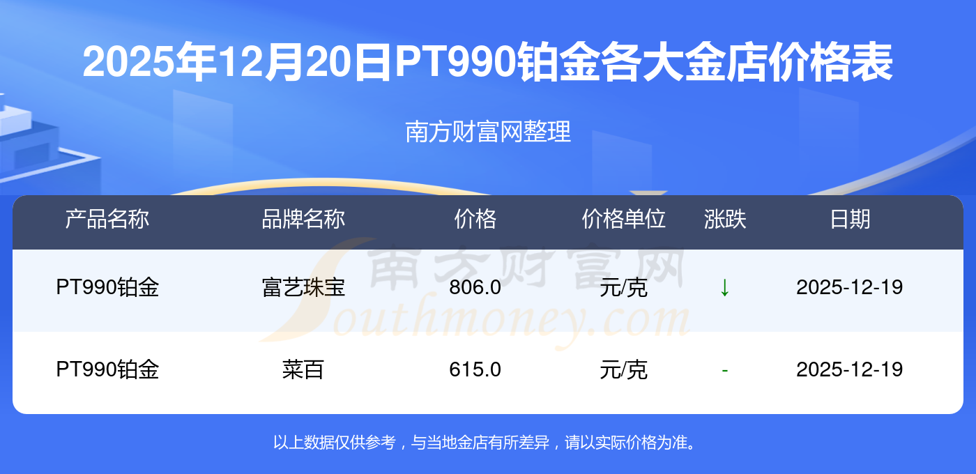 2025年12月20日,星光達珠寶、星光達珠寶、寶泉錢幣、金蘭首飾、金蘭首飾、謝瑞麟、謝瑞麟、謝瑞麟、謝瑞麟、謝瑞麟、金銀街等各大金店品牌PT990鉑金今日價格如下:星光達珠寶1356.0元/克、星光達珠寶720.0元/克、寶泉錢幣15.1元/克、金蘭首飾1356.0元/克、金蘭首飾720.0元/克、謝瑞麟1207.0元/克、謝瑞麟1353.0元/克、謝瑞麟47920.0、謝瑞麟16330.0、謝瑞麟43260.0、金銀街1328.0元/克。